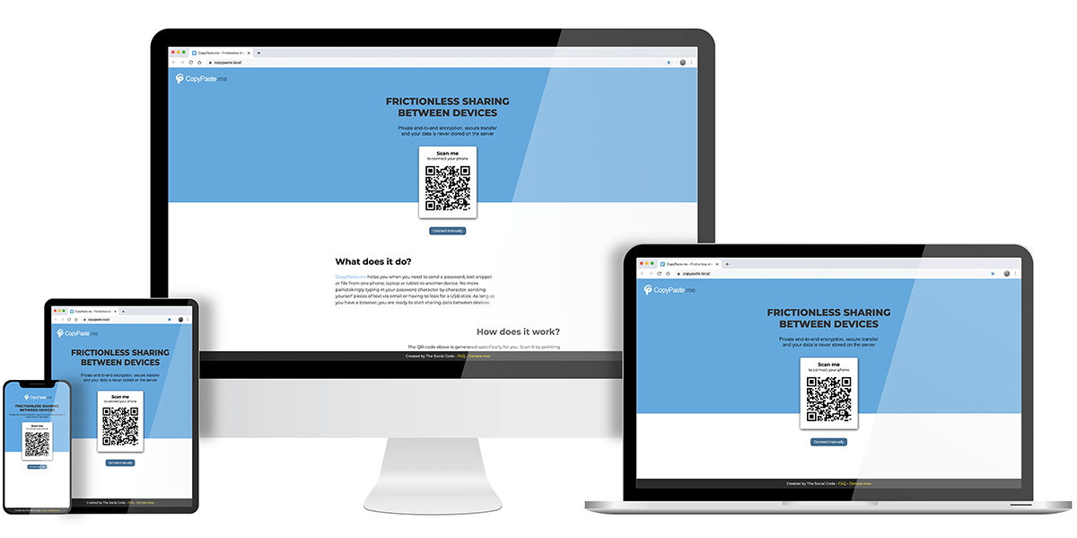 CopyPaste.me has been designed and built with security and your privacy in mind. The tokens (QR-code, the code to connect manually or the secure invite link) you see when setting up a connection all have a short expiry date. The tokens are meant to quickly setup a connection, not to have them wandering around on the internet. Once you connected the two devices and start sharing, the data is transferred using end-to-end encryption so the data can only be accessed on the two devices, not on the server. And to top that, when you send your data, it's immediately forwarded to the receiving device without storing it on the server. Therefore there will be no traces or logs of what you share.